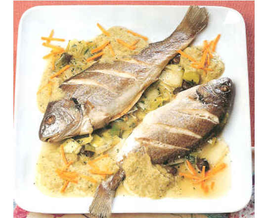 Die Fische mit der Sauce, dem übrigen Lauch und mit Möhrenstreifen